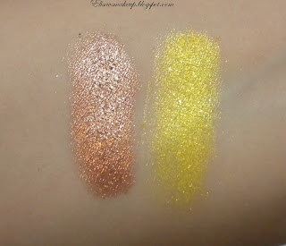 Havana Drum è un bellissimo bronzo di media intensità, che sulla palpebra risulta più chiaro rispetto allo swatch che vedrete,mentre Sunny Side è un bellissimo oro, abbastanza spento, perfetto per queste giornate.